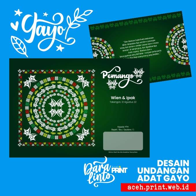 Cetak Undangan Desain Gayo | Pernikahan adalah momen penting dalam hidup seseorang. Untuk membuat momen tersebut semakin berkesan, banyak pasangan yang memilih adat dan budaya mereka sebagai tema dalam acara pernikahan mereka. Salah satu budaya yang sedang populer dalam perhelatan pernikahan adalah budaya Gayo. Budaya Gayo dikenal dengan keindahan dan keunikannya yang khas. Salah satu cara untuk menonjolkan keindahan budaya Gayo dalam acara pernikahan adalah melalui undangan pernikahan dengan desain adat Gayo.